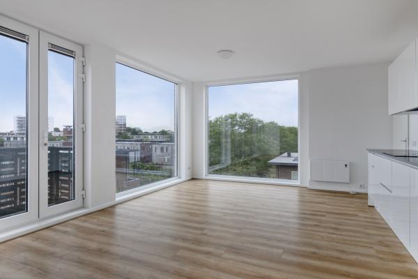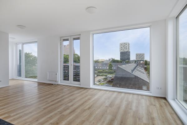 Entree op de 3e verdieping in een ruime hal met toegang tot een aparte berging met de technische installaties en de aansluiting voor de wasmachine. Vanuit de hal kom je in de royale woonkamer (ca. 31m²) met moderne open keuken. De hoge raampartijen, het frans balkon en de hoekligging geven deze ruimte een lichte en open uitstraling. De keuken is voorzien van een inductiekookplaat, combi-oven, koelkast met vriesvak, vaatwasser, afzuigkap, koolstoffilter en voldoende bergruimte. Vanuit de woonkamer zijn zowel de slaapkamer (ca. 13m²) als de badkamer bereikbaar. De badkamer is modern afgewerkt en beschikt over een vaste wastafel met meubel, designradiator, douche en CO2-ventilatie.