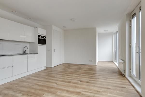 Gelegen op de 3e verdieping, entree in hal met toegang tot aparte berging met de technische installaties en de aansluiting voor de wasmachine. Tevens is de lichte woonkamer (ca. 31m²) met open keuken bereikbaar via de hal. De woonkamer beschikt over hoge raampartijen en een frans balkon waardoor deze veel lichtinval geniet. De moderne open keuken is voorzien van een inductiekookplaat, combi-oven, koelkast met vriesvak, vaatwasser, afzuigkap, koolstoffilter en voldoende bergruimte. Via de hal vanuit de woonkamer zijn zowel de badkamer als de slaapkamer (ca. 13m²) toegankelijk. De moderne badkamer beschikt over een vaste wastafel met meubel, designradiator, douche en CO2 ventilatie.