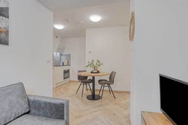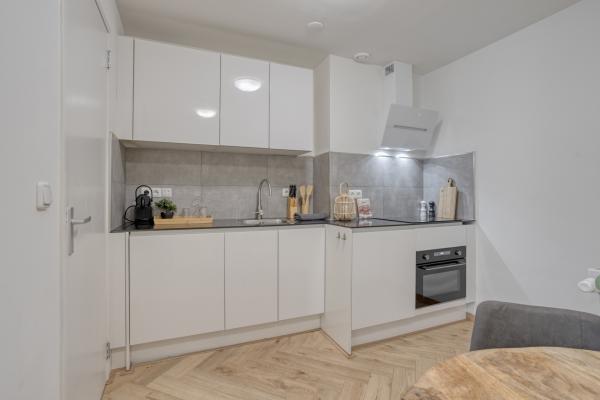 Via de gemeenschappelijke entree kom je binnen in een kleine hal, die toegang biedt tot de lichte woonkamer met ruimte voor zowel een eettafel als een comfortabel zitgedeelte. De moderne open keuken is uitgerust met een vaatwasser, inductiekookplaat, koelkast en combi-oven. De moderne badkamer is uitgerust met een inloopdouche, wastafel en toilet. Vanuit de woonkamer bereik je de aparte slaapkamer én de eigen buitenruimte.