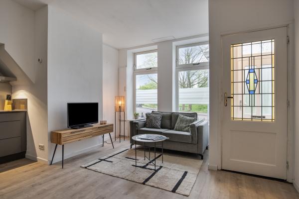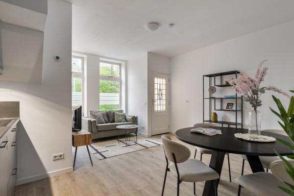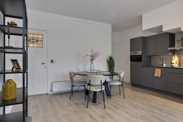 Via de gezamenlijke entree bereik je de voordeur van het appartement. De lichte woonkamer heeft een prettige uitstraling dankzij de grote raampartijen. De keuken is compact maar compleet, met onder meer een inductiekookplaat, afzuigkap, koelkast met vriesvak en een Combi-oven. De slaapkamer grenst aan de achtertuin en badkamer, die is uitgerust met een inloopdouche en een modern wastafelmeubel. In de badkamer is tevens plek voor de wasmachine.