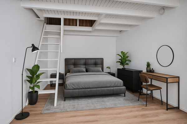 - Twee slaapkamers, waarvan één met vaste trap naar een bovengedeelte;