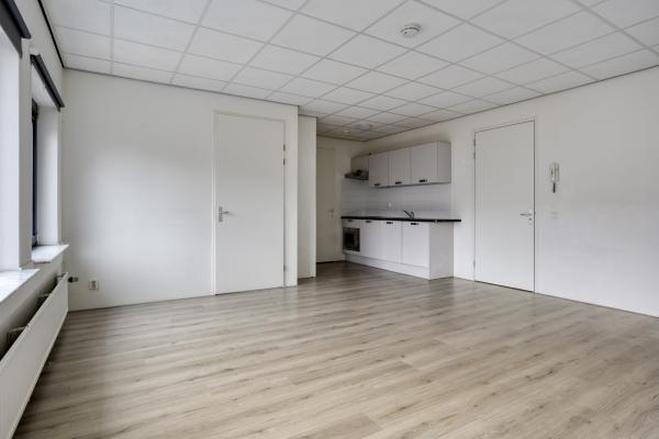 Op de eerste verdieping bevindt zich de entree van het appartement. De ruime en lichte woonkamer van circa 32 m² heeft grote raampartijen en biedt toegang tot beide slaapkamers. De open keuken is uitgerust met diverse inbouwapparatuur.